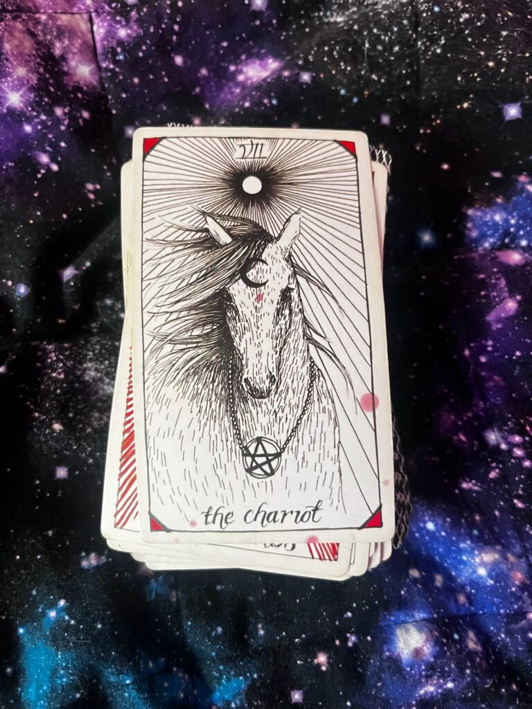 The Chariot is a guiding force; it may come from intuition but it is there. And she is represented by a horse. Which means once you get on, prepare to keep going using your own strength and compass, or be dragged.